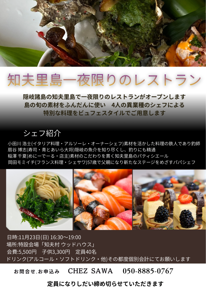 11/23(日) 知夫村ウッドハウスで4人のシェフによるブッフェスタイルのレストランをオープンします。ご参加お待ちしております。